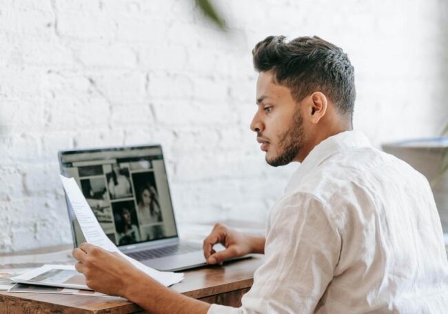 SEO Person sitting at a table with a laptop and a stack of paperwork